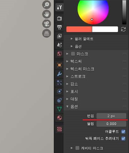 먼저 언급을 해야 하는 것이 있는데, 위 스크린샷처럼 texture paint 윈도우에서 볼 수 있는 프로퍼티 윈도우에서 번짐이라고 할 수 있는 항목이 있습니다. 이 항목이 왜 중요하냐 하면, 이게 0이 되면 UV맵에서 작성해 놓은 경계선이 색을 칠할때 보이게 되는 단점이 있습니다. 그래서 언제나 적정값을 주어야만 합니다.