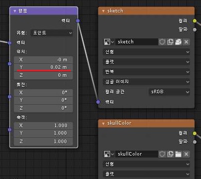 그리고 다른 2번째 채색도 옮겨야 하기 때문에, 위 스크린샷에서 볼 수 있는 노드에서 두번째 벡터도 옮겨 주도록 합니다. 이렇게 해서 두번째 채색 텍스쳐 이미지도 이동이 되었느냐 하면.........