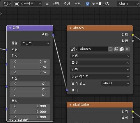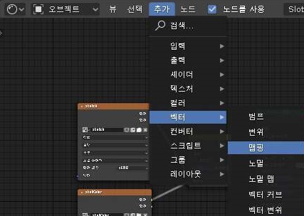 그리고 나서 맵핑의 벡터라는 항목을 이동시키고자 하는 이미지 텍스쳐의 노드에 있는 벡터 항목에다가 연결하는 것으로 준비는 끝이 납니다.