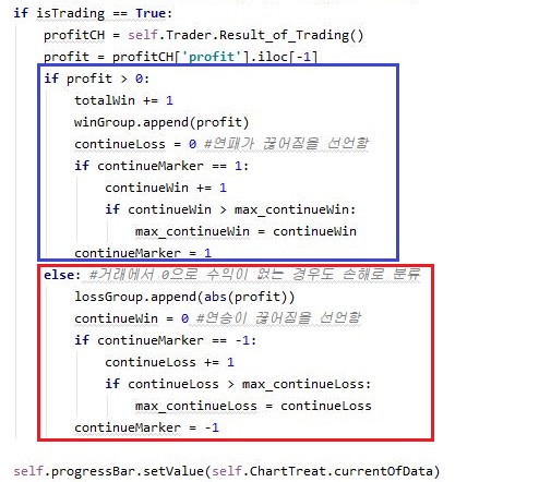 이렇게 해서 차익인 profilt이 0을 초과하면 이익이 나온 것으로 간주하고, 아닌 모든 경우 - 0이 나온 경우까지 모두 손해로 간주애서 작업을 하도록 합니다.