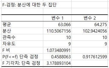 여기서는 F 검정 결과 양측검정 P 값이 유의수준 보다 훨씬 크기 때문에 등분산이 성립한다는 것을 알 수 있었습니다. 이걸 바탕으로 해서 다음의 T 검정을 받도록 합니다.