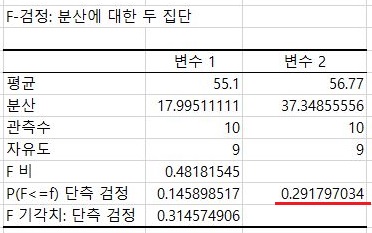 그리고 나서 양측검정을 한번 해 보았더니, 여기서 나오는 값을 가지고서 한번 알아보니, 0.05라는 유의수준을 양측 P 값에서 겨우 넘기는 것을 볼 수 있었습니다. 이래서 등분산이 성립하기는 한다는 것을 알 수 있었습니다.