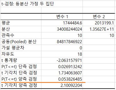 그리고 나서 한번 등분산을 가정한 T 검정을 가지고 보았더니, 여기서 볼 수 있는 것은 겨우겨우 유의수준을 넘어가서 유의수준이 없다는 결론을 낼 수 있었습니다.