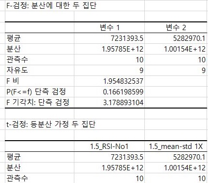그리고 나서 다음으로 확인할 수 있는 것으로는 F 검정을 먼저 받아서 등분산 여부를 알아보고 그에 따른 T 검정을 받아보는 작업을 계속 이어서 했습니다.