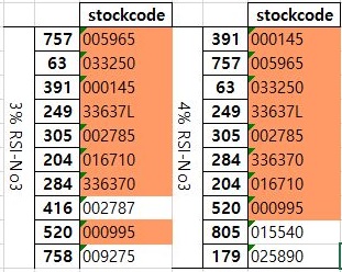 그리고 나서 3%와 4%의 손절매 조건에 대해서 한번 알아보기 위해서 작업을 하도록 합니다. 여기서도 2개의 종목만을 제외한 나머지 종목들은 모두 일치하는 것을 확인할 수 있었습니다.