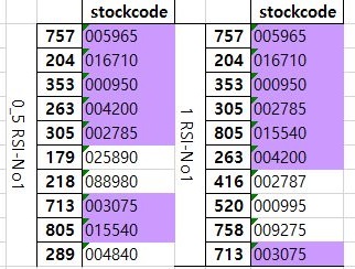 그리고 나서 위 스크린샷에서 볼 수 있는 것처럼 일단 1%와 2%의 조건에 대해서 한번 비교를 해 보았습니다. 여기서도 일단 확인할 수 있는 것으로는 2개의 종목을 제외하고는 거의 일치한다는 것 입니다. 이렇게 해서 일단 작업을 해 보았는데, 아직 이것만 가지고서는 다음 작업을 생각하기에는 아직은 2% 모자란 다는 생각이 듭니다.