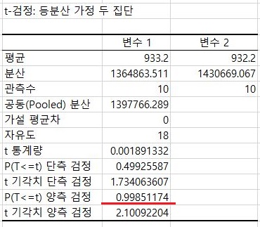 그런데 유의수준 0.05를 기준으로 했을 때 전혀 유의차가 없다는 결론이 나오는 것을 확인할 수 있었습니다. 일단 첫번째 비교는 그렇게 끝이 났습니다.