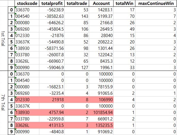 이렇게 해서 결과적으로 이익을 본 종목이 일단 3종목 나오기는 나왔습니다. 이렇게 테이블을 먼저 정리 하도록 했으며, 다음으로는 F 검정과 T 검정을 받도록 합니다.