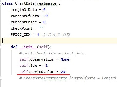 다음으로는 간단한 버젼의 Bollinger Band를 계산하기 위한 다음의 작업에도 들어가 보도록 합니다. 여기서도 역시나 숫자로 되어 있는 변수를 self붙은 변수로 바꾸어 주도록 합니다.