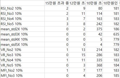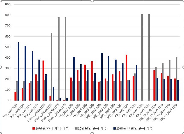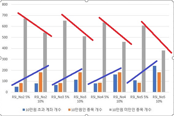 그렇게 해서 이제 5%와 10% 손절매의 조건을 한번 비교해 보고자 했습니다. 일단 너무 한꺼번에 비교를 하게 되면 번잡한 면이 있어서 하는 수 없이 각각의 매도/매수 조건에서 한번 비교를 해 보아야 했습니다. 일단 RSI기반 룰에서 먼저 5%를 세우고 다음에 10%를 세웠는데, 우선 손해를 보는 종목의 갯수는 확실하게 내려갔고, 이익을 보는 종목의 갯수는 확실하게 늘어났습니다.