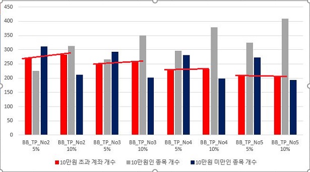 그런데 대신 10%의 조건에서는 이익을 본 종목의 이익수준이 좀 떨어지는 경향을 보이는 것을 확인할 수 있었습니다. 그래도 이익을 보는 종목의 갯수가 늘어난 것에 만족을 해야 겠습니다.