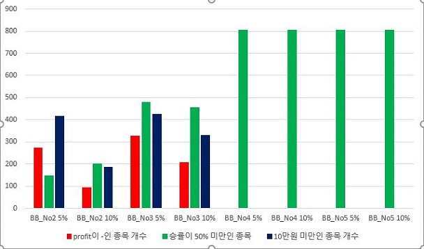 다음으로는 간단하게 계산을 하였는 Bollinger Band를 가지고서 한번 작업을 해 보았고, 여기서도 역시나 전혀 거래가 없었는 2종류의 조건을 제외하고는 비슷한 결과를 얻을 수 있었습니다.