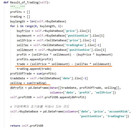 이 작업을 하기 위해서 원래라면 profit이라는 리스트만 있었지만, 여기서는 trading이라는 리스트를 새로 만들어 주어서 이제 profitDB에 추가된 column을 가지고 오도록 해서 합계를 구할 수 있도록 만들어 줍니다.