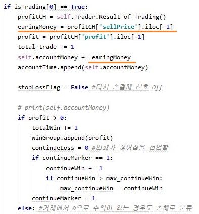 일단 이래저래 하면서 이제는 수익이 나오면, 세금을 제외하고 계산을 하도록 합니다. 어차피 차이는 나중에 profit을 구하는데 들어가도록 하고, 여기서는 계좌 - 자본금에 반영을 하는 따로 만들어 둔 내용을 가지고 오도록 합니다.