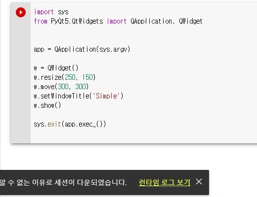 그래서 한번 간단한 pyqt5의 코드를 가지고서 유저 인터페이스를 띄우고자 했습니다만, 이것 조차 여기 구글 코랩에서는 제대로 뜨지 않는 것을 확인할 수 있었습니다. 그래서 하는 수 없이, 일단 GUI를 띄우는 것은 여기서는 포기하고 다른 방법을 찾아야 한다는 결론을 얻은 채로 1라운드가 끝이 났습니다.