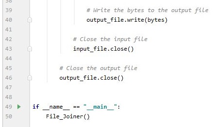 그리고 나서 py파일을 머릿 부분입니다. 역시나 import하기 위한 모듈로는 os모듈이 전부이고, 여기서는 반대로 분할파일들이 있는 폴더를 지정한 다음에, 어떤 파일로 나올지를 결정해야 합니다. 그리고 중요한 것이 어느정도 사이즈로 분할이 되었는지 정확하게 지정해야 핧 필요성이 있습니다.