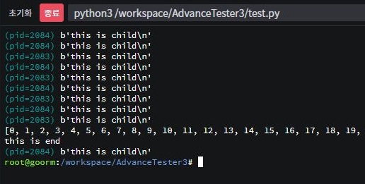그리고 나서 실행을 해 보기는 보았습니다만, 위 스크린샷에서 볼 수 있는 것처럼 일단 제대로 자식 프로세스에서 나온 print함수가 반영이 되는 것을 확인할 수 있었습니다.