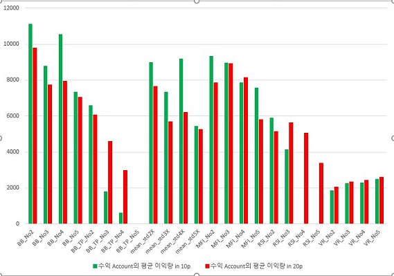 일단은 먼저 Account가 수익을 남기는 쪽으로 끝난 종목만을 모아서, 이 액수들이 얼마나 되는지를 한번 비교해 보았습니다. 다만, 전체적으로는 20period에서 나온 결과가 수익을 덜 보기는 덜 보는 경향이 전체적으로 있어 보입니다.