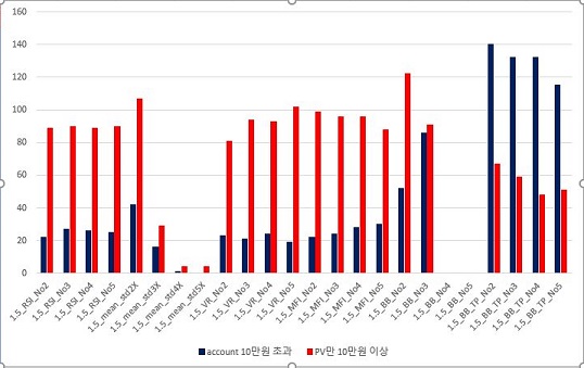 그리고 다음으로는 account에서 이익을 낸 종목의 갯수와 PV상으로만 수익을 낸 종목의 갯수에 대해서 비료를 하도록 했습니다. 이 경우에는 Bollinger Band에 TP를 사용한 사례 외에는 모두 PV만 수익이 더촣은 것으로 나옵니다.
