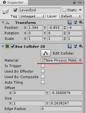 먼저 위 스크린샷에서 볼 수 있는 것처럼, 일단 레버 엔드라는 오브젝트를 추가합니다. 여기다가 위치만 맞추어 주고, 그 다음에는 Box Collider2D를 추가시켜 주도록 합니다.