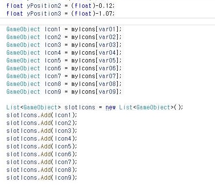 그리고 나서 각각의 슬롯 아이콘을 게임 오브젝트로 만든다음에, 이걸 하나의 리스트에 집어넣어 주도록 합니다. 이렇게 하는 것으로 하나의 작업은 완료가 되었습니다.