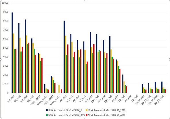 그리고 나서 처음으로 그린 그래프를 역시나 Account상으로 나온 이익량에 대해서 비교하는 그래프를 그렸는데, 전체적으로는 일단 %가 커지면 커질수록 점점 줄어드는 경향이 있지만, 무언가 40%에 와서는 약간 다른 것 같은 감도 듭니다.