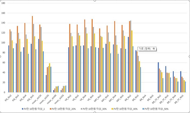 그리고 나서 다음으로 알아보고자 해서 그려놓은 그래프는 바로 PV - 포트폴리오 가치를 측정한 결과, 수익이 난 종목의 갯수인데, 이 수치역시 그래프를보면 전체적으로 50%의 손절매 조건에서는 감소하는 것을 확인할 수 있습니다.