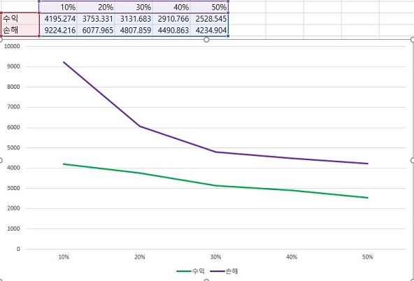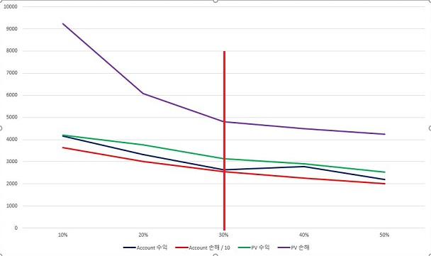 그리고 나서 한번 비교를 해 보자면, 일단 20%에서는 상대적으로 완만하게....... 라고 할까 수익은 정말 완만하게 감소하지만, 손해는 30%를 시점으로 해서 그다지 감소하는 효과가 없는 것을 확인할 수 있었습니다.
