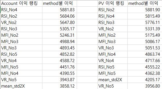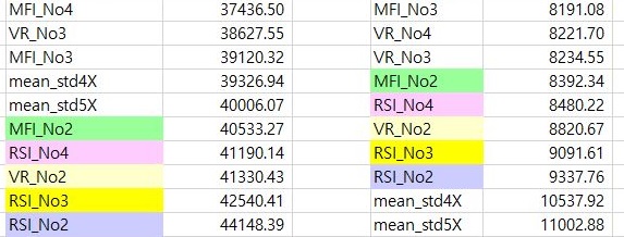 그래서 한번 중간쯤에 있는 룰이 있는지 찾아보았습니다. 상당히 난잡해 보이기는 한데, RSI_No5, VR_No4, MFI_No5, MFI_No4, VR_No5, mean_std2X 같은 조건이 중간쯤의 수익에 위치해 있었습니다.