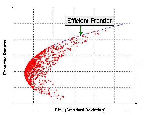 일단 효율적 투자선이 무엇이냐고 하면, 간단하게 말해서 엄청나게 많은 종류의 포트폴리오를 구성해서 리스크와 기대가 되는 수익을 그래프를 그려서, 이렇게 리스크는 적으면서 이후에 수익으 큰 포트폴리오를 만드는 이론이라고 합니다. 일단 제가 책에서 보기로는 저 이론으로 노벨 경제학상도 나왔다고 하는데, 일단 이 이론을 한번 사용해 보고자 합니다.