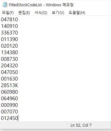 일단 이렇게 해서 나온 52개의 종목을 가지고서 어떻게 테스트에 들어가 보기 위해서, 위 스크린샷에서 볼 수 있는 것처럼 텍스트 파일에 옮겨 주도록 합니다.