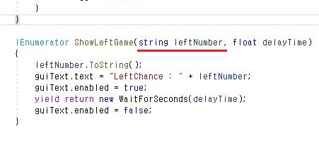 먼저 위 스크린샷에서 볼 수 있는 것처럼 일단 원래는 int형식의 변수인 leftGame02라는 변수의 뒤에다가 .을 찍고 ToString()이라는 변수를 입력해 보는 것으로 일단 작업을 시작해 보도록 합니다.