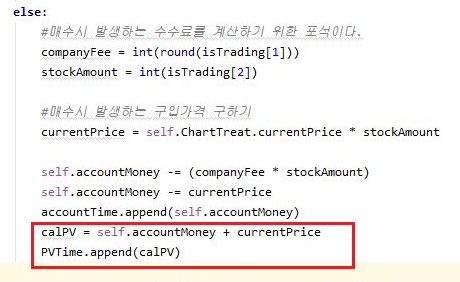 그리고 나서 매수가 발생하면, 일단 포트폴리오 가치는 붉은색 박스안에 들어가 있는 코드처럼 변하라고 입력을 하도록 해 봅니다.