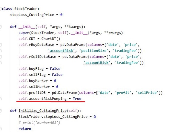 그리고 나서 다음으로 해야 할 것으로는 위 스크린샷처럼 기존의 메서드에 더 정밀한 계산을 하기 위해서 일단 초기 자본금과 계좌에 대한 리스크 퍼센트를 가지고 오도록 합니다.