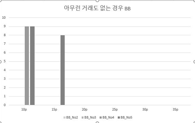 그리고 나서 다음으로 진행해야 하는 것으로는 역시 typical price를 사용한 bolinger band의 경우인데, 이번 경우에 있어서는 어떻게 된 것인지 모르겠습니다만, period가 늘어나면 늘어날 수록 점점 거래가 없는 경우가 늘어나다가 아예 거래 자체가 없는 경우가 나오고 있습니다.