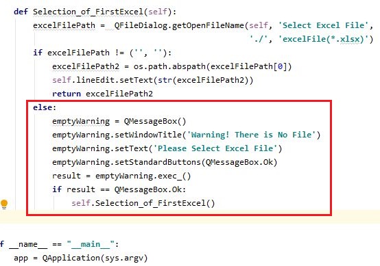 일단 경로가 공백이다 = 완전히 지정이 되지 않았다고 할 수 있는 경우라면, 위 스크린샷에서 볼 수 있는 것처럼, 일단 경고창을 띄우고, 그리고 나서 지정이 될 때 까지, 계속해서 같은 메서드가 호출이 되도록 만들어 줍니다.