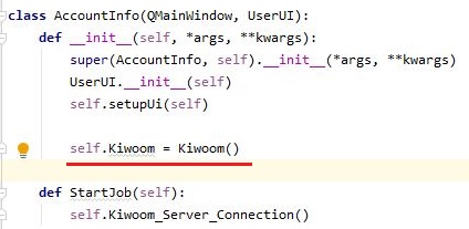 그리고 나서 Kiwoom.py를 가지고 올 수 있도록 일단 하나 지정을 해 주기는 주도록 합니다. 이렇게 해서 다음으로 갈 준비를 합니다.