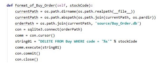 그리고 나서 다음으로 해야 하는 것으로는 역시 대기중인 명령 = Buy_Order를 제거할 수 있도록 무언가를 하기는 해야 합니다. 그래서 일단 DELETE FROM 테이블 이름 WHERE 조건 이라는 식으로 해서 특정한 열(row)만 제거하는 것이 가능하기는 합니다.