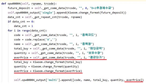 먼저 기존의 보유하고 있는 주식을 가지고 오는 작업을 하였는데, 여기서는 한가지 주목해야 할 것이 하나 있습니다. 바로 그전에는 없던 평균단가를 가지고 와서, 이걸 활용해 보자고 생각을 해 보았습니다.