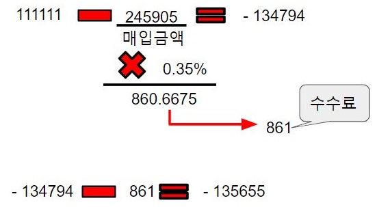 일단 생각외로 엄청나게 많은 양을 매수한 이 종목에 대헛 알아보고자 합니다. 일단 여기서 수수료를 소수점 아래 반올림 해서 861로 했는데, 그러자 거의 나누어 놓은 계죄의 111111만원에서 245905원어치를 매입했으니, 당연하다면 당연하게도 이건 마이너스를 기록하게 될 것 이 뻔합니다. 그후 수수료까지 계산해 보니, 예상치 않게 합리적으로 맞는 액수라는 것을 알 수 있었습니다.