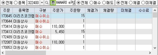 그러다가 이제서야 제대로 무언가가 되는 것인지 매수취소가 연속으로 나오는 것을 확인할 수 있었습니다. 이렇게 해서 나왔는데, 이제 다음의 작업에 들어가 봐야 합니다.