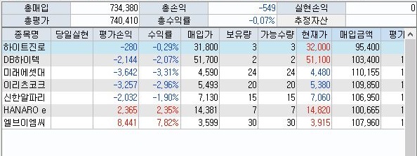 그리고나서 전체 계좌에 대한 것을 일단 캡쳐했습니다. 일단 여기서 알 수 있는 것은......... 몇몇 종목이 매도를 기대할 수 있는 수준으로 올라간 듯 합니다.