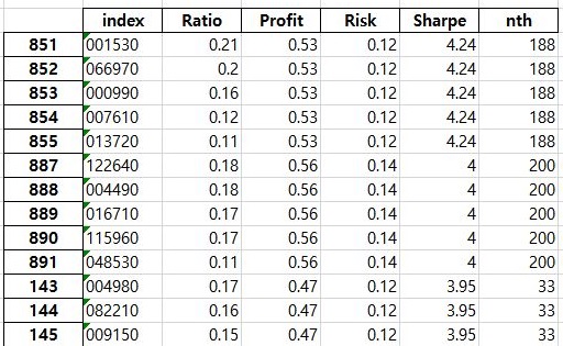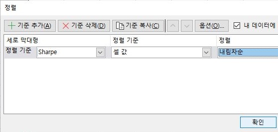 그리고 나서 다으음으로 봐야 하는 것으로는 일단 샤프지수가 3 이상으로 큰가 아닌가 하는 여부인데, 일단 이 결과를 정렬해 보도록 합니다.