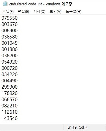 이번에는 19개 종목이 남았는 것을 확인할 수 있었습니다. 이렇게 해서 숫자는 많이 줄어들기는 줄어 들었지만, 그래도 여전히 많아서 다시한번 더 효율적 투자선을 만드는 실험 - 3번째 필터링에 들어가 봐야 하는 단계까지 왔습니다. 이 결과는 다음 포스팅에서 다루어 보도록 하겠습니다.