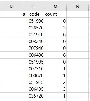 일단 일일히 셈을 할 수는 없는 노릇이니, 위 스크린샷에서 보이는 것처럼 countif를 하고, 조건에는 특정한 값이 들어가 있는 셀 = 종목코드가 하나 있는 셀을 지정하는 것으로 간단하게 처리할 수 있습니다.