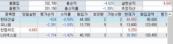 그리고 매수타이밍이 좋지 않았는지 보유하고 있는 주식의 가치가 더 떨어져서 전체적인 손해가 더 커지기는 했습니다. 다만 이게 이제 겨우 얼마 되지 않은 시점이고, 좀 더 지나봐야 하기는 합니다. 아무튼 계속해서 이 실험은 진행해 보고자 합니다.