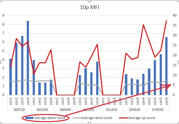 역시나 보조축의 눈금 단위를 보시면, 너무 커서 나머지 횟수는 다 가려지는 효과를 보여주고 있습니다. 즉, 지금 현재 사용하고 있는 MFI지수도 그렇게 까지 좋은 방법은 아니라는 말이 나옵니다.