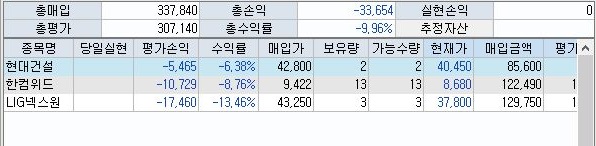 이 상황에서 어째서 인지 보유하고 있는 주식의 가치는 더 낮아져서 위 스크린샷에서 나와 있는 것처럼 손해는 더 불어나고 있는 중 입니다.