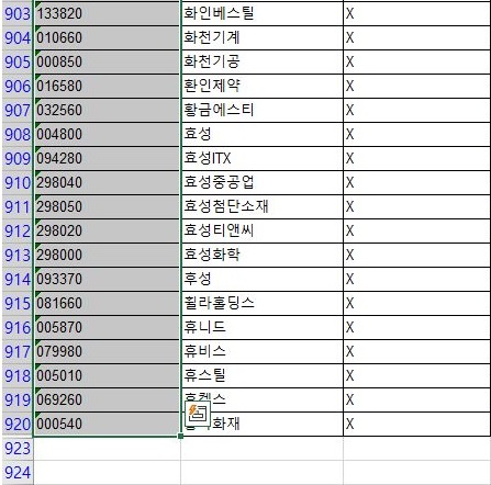 일단 이렇게 해서 코스피에서는 919개의 종목 리스트를 가지고 올 수 있었습니다. 이 종목들에 대해서 맞는지 확인을 하다 보니, 쌍용자동차가 제대로 거래정지 종목에 들어간 것도 확인할 수 있었습니다.