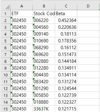 그리고 나서 각각의 ETF별로 모아놓은 다음에 베타값을 내림차순으로 정렬하니까, 드디어 어느정도 쓸만하다 싶은 정도로 베타의 값이 나오는 것을 확인할 수 있었습니다.